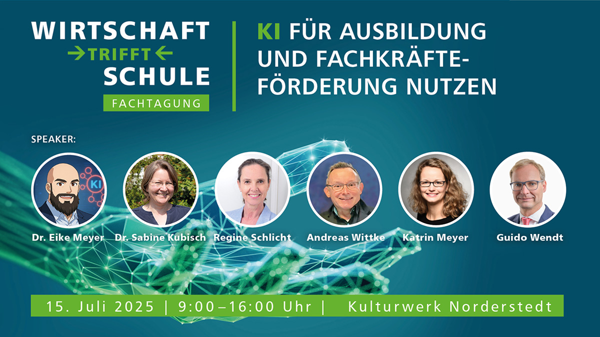 Am 15. Juli 2025 lädt die EGNO gemeinsam mit der Stadt Norderstedt zur Fachtagung „Wirtschaft trifft Schule: Innovation durch Künstliche Intelligenz“ ein. Im Mittelpunkt steht der Austausch zwischen Bildung, Wirtschaft und Politik zur Frage, wie Künstliche Intelligenz die Fachkräfteausbildung der Zukunft gestalten kann.